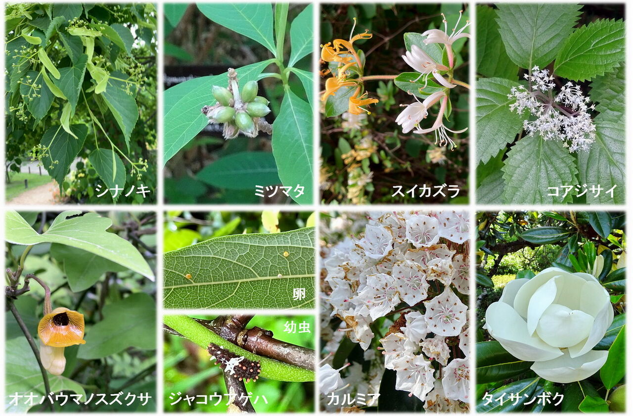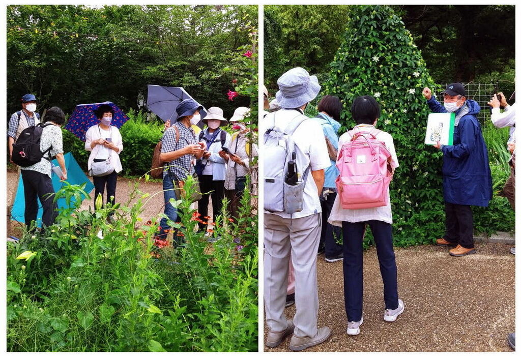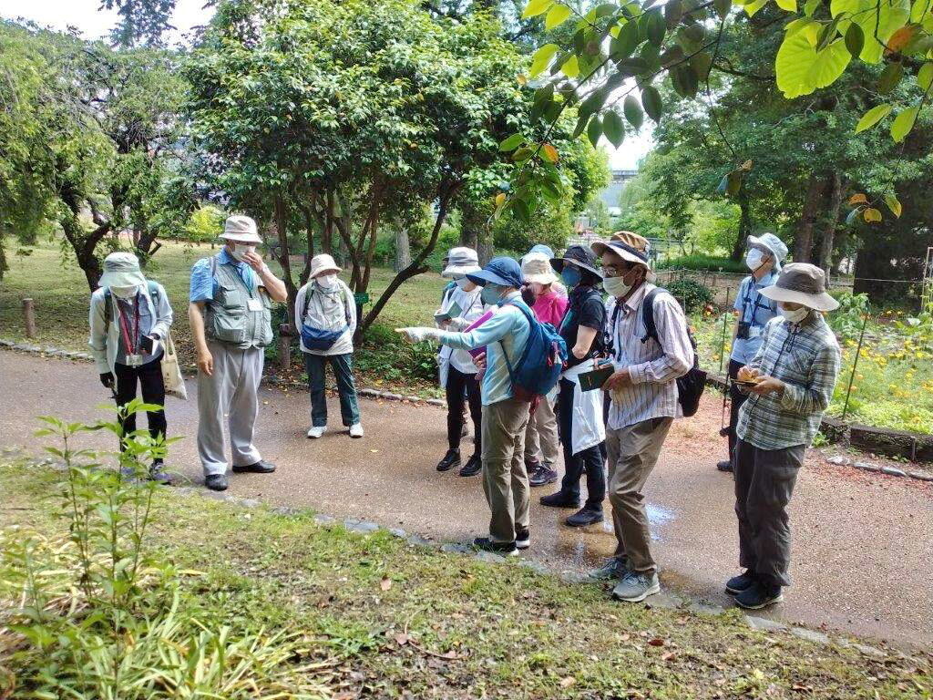 まずは北山門のワイルドガーデンからスタート。トケイソウの大きな花に引き寄せられました。花弁が10枚のように見えるのですが、実は萼片と花弁が5枚ずつです。雌しべの柱頭が3つに分かれ、それが時計の針のように、副花冠が文字盤のように見えるので『時計草』と言います。雄しべは5本あり、開花時は葯が上を向いていますが、一定の時間が経つと下を向きます。また、何かが触れるとクルリと下を向きます。面白いですね。雄しべも雌しべも大きくてわかりやすく、特徴的な花です。皆さん熱心に観察されていました。