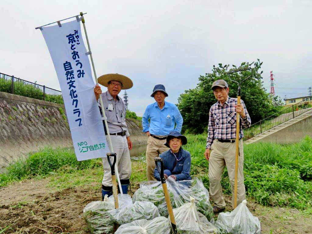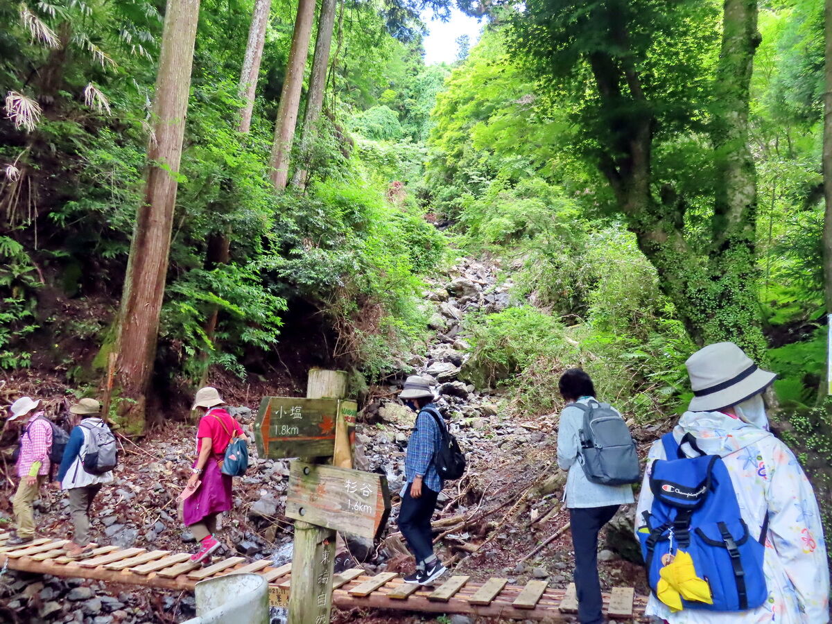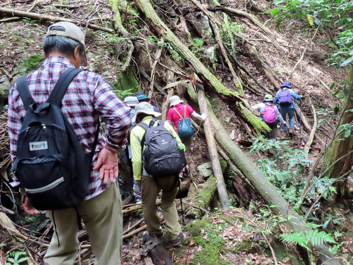 近畿は先週から梅雨入りとなり当日の雨を心配していましたが、やっぱり雨でした。しかし、皆さんこの雨を覚悟の上で参加してくださいました。参加者は23名(会員21名、一般参加者は岡山から2名)でした。6月のリーダーは、大川内さん、澤田章夫さんで、2チームに分かれてスタートしました。以下、澤田さんチームの報告です。