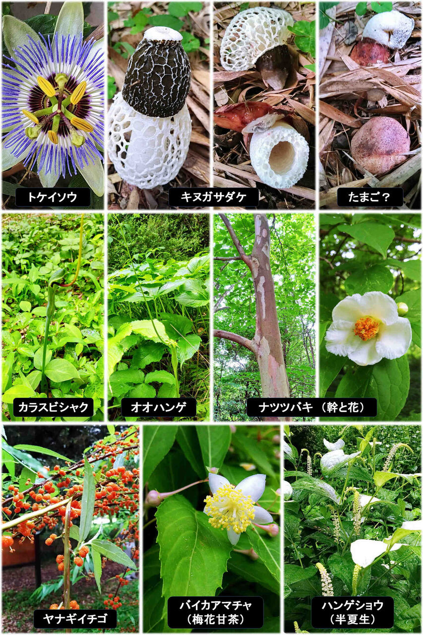 竹林の一角でカラスビシャクの説明がありました。サトイモ科の植物で、乾燥させた根茎は「半夏」の名前で、生薬として重宝されています。七十二候の「半夏生」は正しくはカラスビジャクのことを指すそうです。生薬として重宝されるため、昔は農家の人の小遣い稼ぎになり、思わぬへそくりになったことから「ヘソクリ」という名称もあるらしいのです。葉は3枚の小葉があり、花茎は、葉の高さより上にでるのが特徴です。似た仲間に、オオハンゲがありますが、こちらは葉が大きく、3枚の小葉の基部がつながっています。また花(仏炎苞)は、葉と同じ高さか、葉の中に隠れています。オオハンゲは生態園の中にあり、後程確認しました。似たような植物で間違いやすいのですが、二つを比較する事でよく理解出来ました。