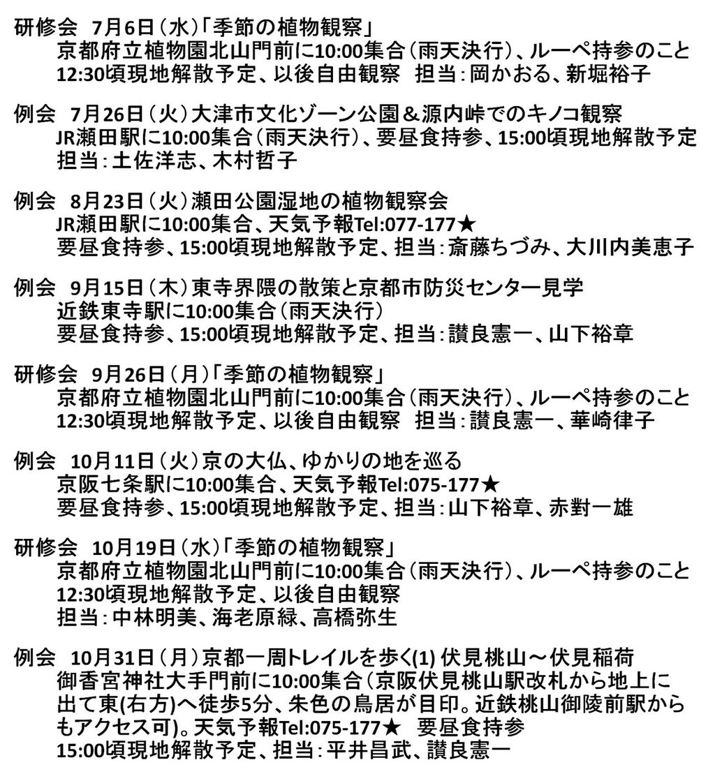早くも発生した台風の接近を心配しましたが、前日には温帯低気圧に変わり晴れ間も見える天気となりました。参加者は、26名(会員22名・実習生4名)でした。今月のリーダーは岡かおるさん、新堀裕子さんのお二人です。以下岡さんチームの報告です。