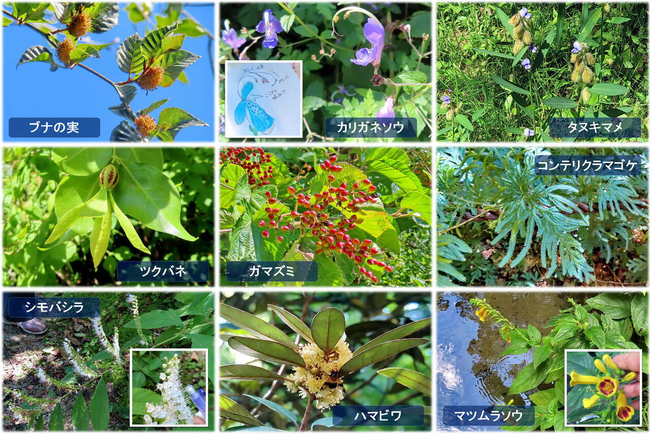中林さんの班:アジサイ園の中でカジノキの実の説明をされていました。イチゴのような朱赤に熟した丸い実がぶら下がっていました。いかにも甘くて美味しそうです。葉っぱは触るとゴワゴワした感じです。古代から七夕飾りの短冊の替わりに使われて、神にささげる神木で神社などに植えられたそうです。カンレンボクは、まるでミニバナナが集まっているような実をつけていました。面白い名前が付いたネコノチチも色が緑から黄色、橙、赤と変えていく段階が見られました。
