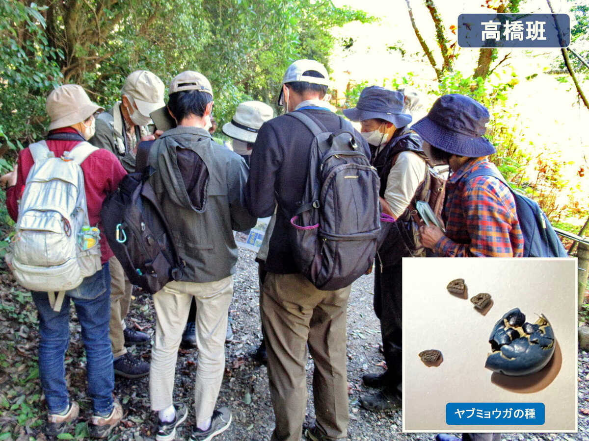 高橋さんの班:ヤブミョウガのタネの面白さのお話しです。ミョウガに似た葉を広げて青光りする実をつけていますが、この実の中は20~30個のタネが立体パズルのように詰まっているということです。一つ果皮をはがしてみると、コンクリートブロックのようなタネがぎっしりありました。