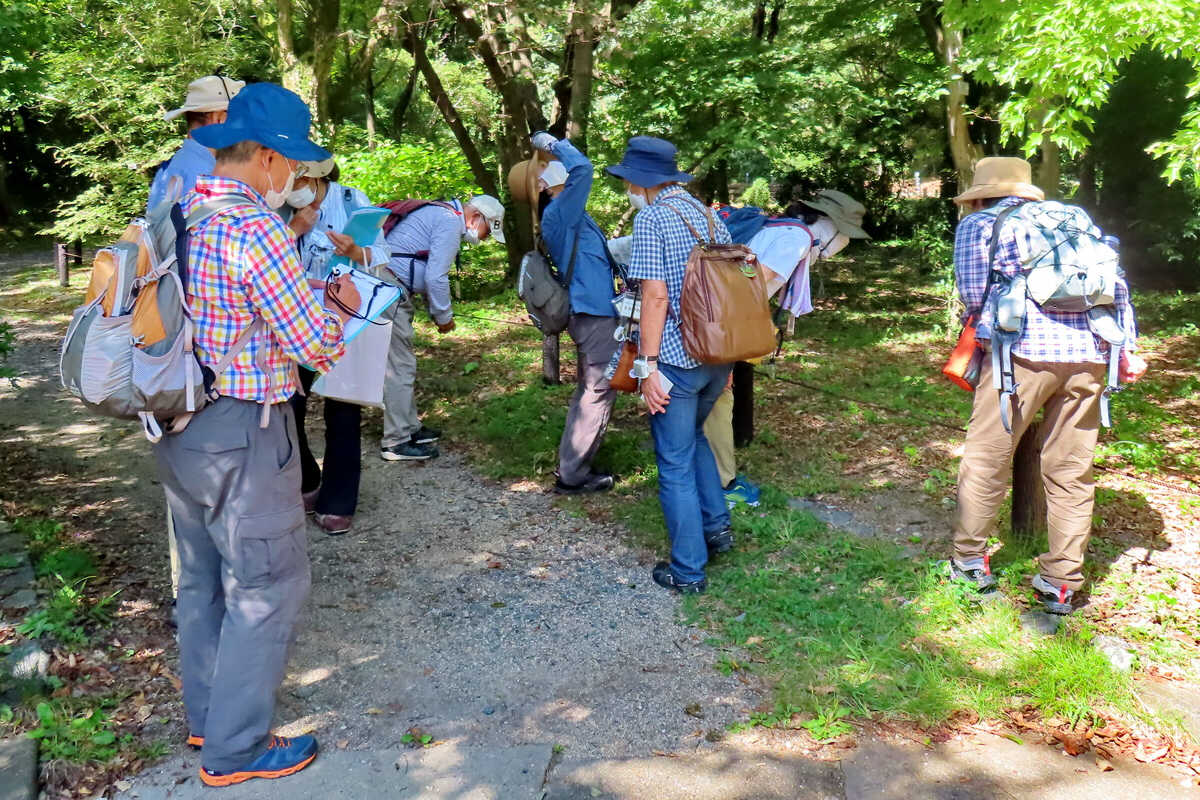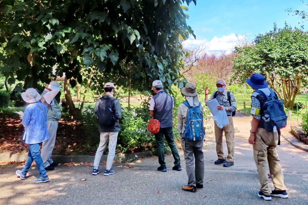 秋が一歩進んだような冷え込んだ朝でした。でも、集合時間には日差しも届いて上着を一枚脱ぎたいような気温まで上がりました。朝礼で今日の実習生4人の方の紹介の後、去年デビューされた3人の講師の海老原さん、高橋さん、中林さんをリーダーに3班に分かれてスタートしました。参加人数は会員16名に、インプリ科など一般6名の計26人でした。 (12時30分に正門前で解散)