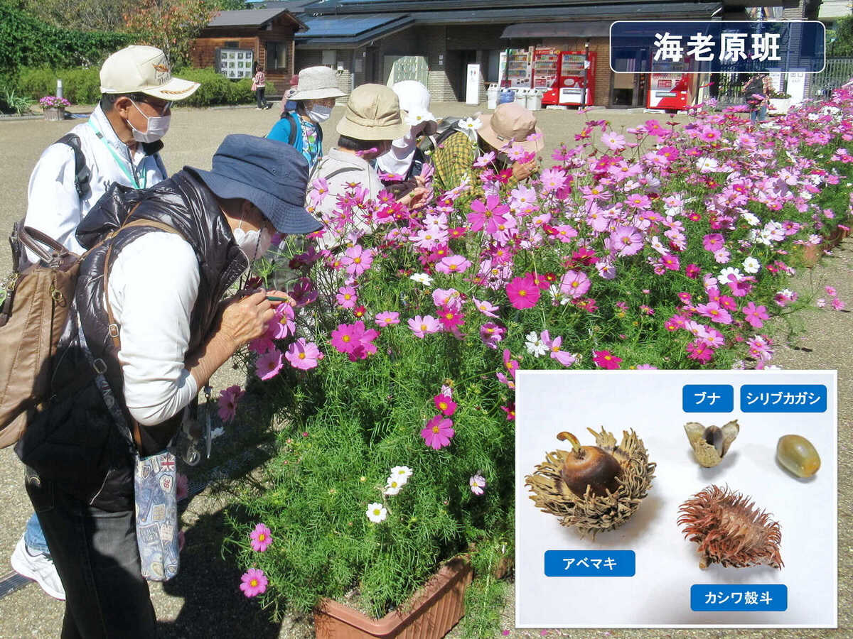 海老原さんの班;私は一番秋を感じる花がコスモスです。この北山門前のプランターに植えられたコスモスは、今日の講師の海老原さんや高橋さん達植物園でボランティア活動をされている方々が7月に播種されて育てたそうですが、ちょうど見頃を迎えていました。コスモスの花のつくりは、ひとつに見える部分はたくさんの小さい花の集まりで、2種類の花の舌状花(虫を呼び寄せる広告塔の役割)と筒状花(受粉して果実を作る)があると言う説明がありました。