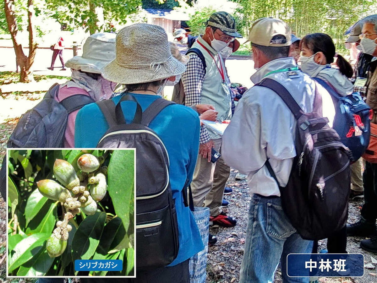 イチイガシとスダジイの説明を受けて、最後に正門近くにあるシリブカガシに案内。ドングリの底が凹んでいる事から名前がついたことやふんわりした花がまだ残っていて、花と実を同時に見られました。深まっていく秋を感じた観察会でした。