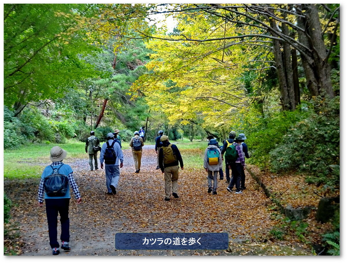先ずは、伏見桃山城方面に向かう、分岐点には「京都一周トレイル」の表示板が設置されており一人でも迷うことはなさそうだ、少し歩くと左右が国有林となった砂利道の桃山御陵参道が延びる、参道では近くのちびっこさん(園児達)と挨拶を交わし伏見桃山城入口へ、伏見桃山城天守を見上げ小休止後は、ひたすら歩く、カツラの葉が黄葉して甘い匂いをはなっている道を過ぎると登り道に差し掛かる。