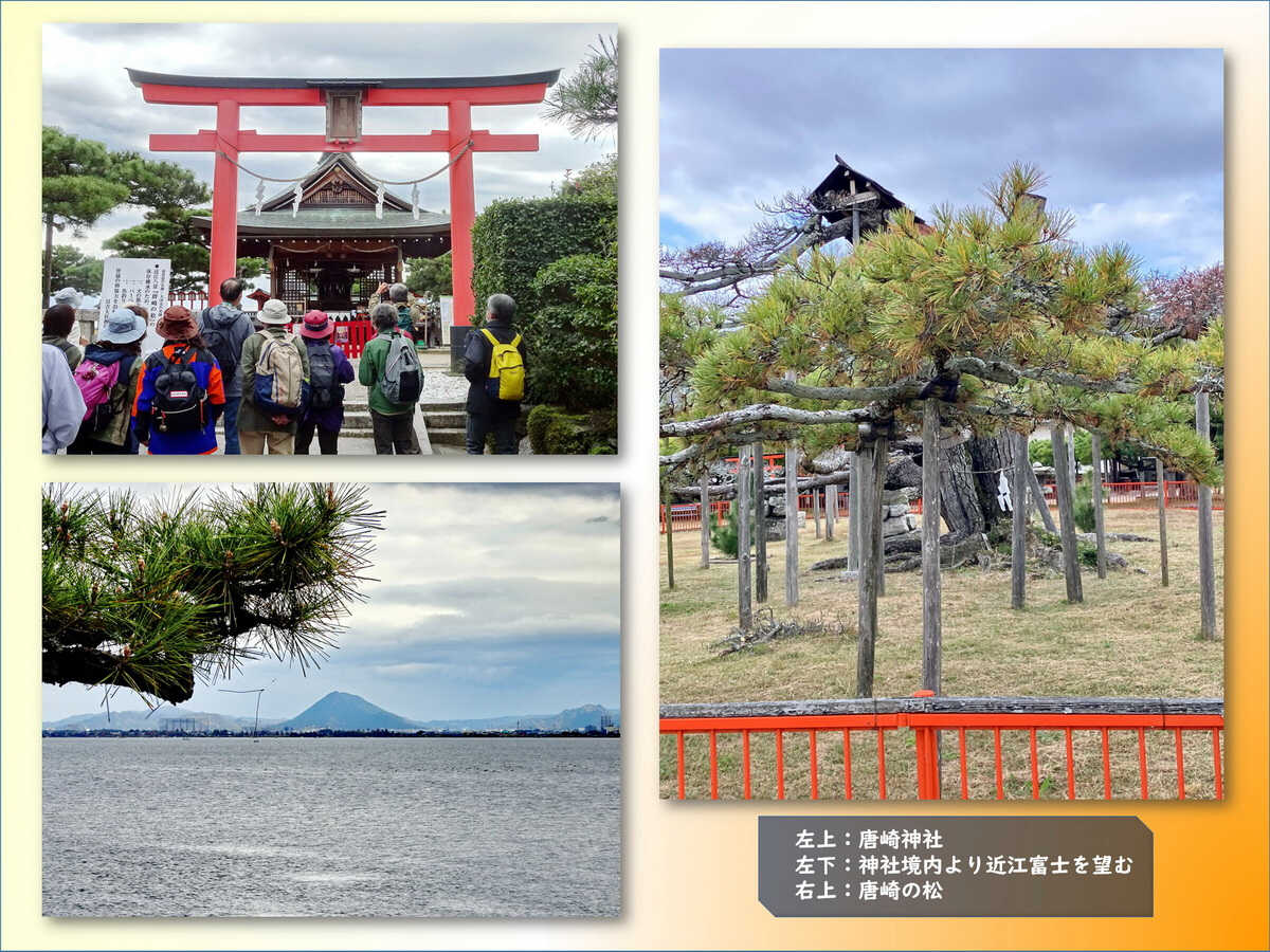 駅から琵琶湖に向かってしばらく歩くと唐崎神社。琵琶湖に面した境内からの景色は、湖面のはるか対岸に近江富士が望める近江八景のひとつ。境内には歌川広重の浮世絵「唐崎の夜雨」で知られる唐崎の松があるが、大部分は枯れて当時の面影はなく残念であったが、横に広がる枝ぶりは見事であった。