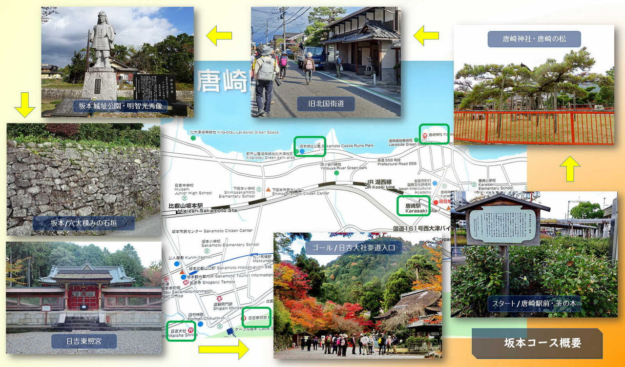 北国街道をしばらく北上した後、右折して湖岸方面へ進むと坂本城址公園に着く。琵琶湖に面した広い公園で園内には明智光秀の石像がある。湖岸に出て、坂本城のあった場所と湖底に沈む石垣の場所を教えてもらった。坂本城は織田信長の命により明智光秀が築城し、絢爛豪華な城だったらしいが、石垣などの遺構が見られないのは残念である。また、織田信長は琵琶湖に城郭ネットワークを敷き、坂本城(明智光秀)、長浜城(羽柴秀吉)、安土城(織田信長)、大溝城(織田信澄、信長の甥)の4つの城を築くことで近江を支配しようとしたとのこと。湖面には多くのカモが戯れていた。東屋があるのでここで昼食。 午後は、坂本城落城で討ち死にした城主の明智一族とその家来の首塚がある東南寺の横を通り、坂本城跡碑を見た後、下坂本町を歩き、酒井神社に立ち寄る。酒井神社の道路を隔てた対面に両社神社があるが、両神社の鳥居や建物が左右対称に配置されているのが面白い。