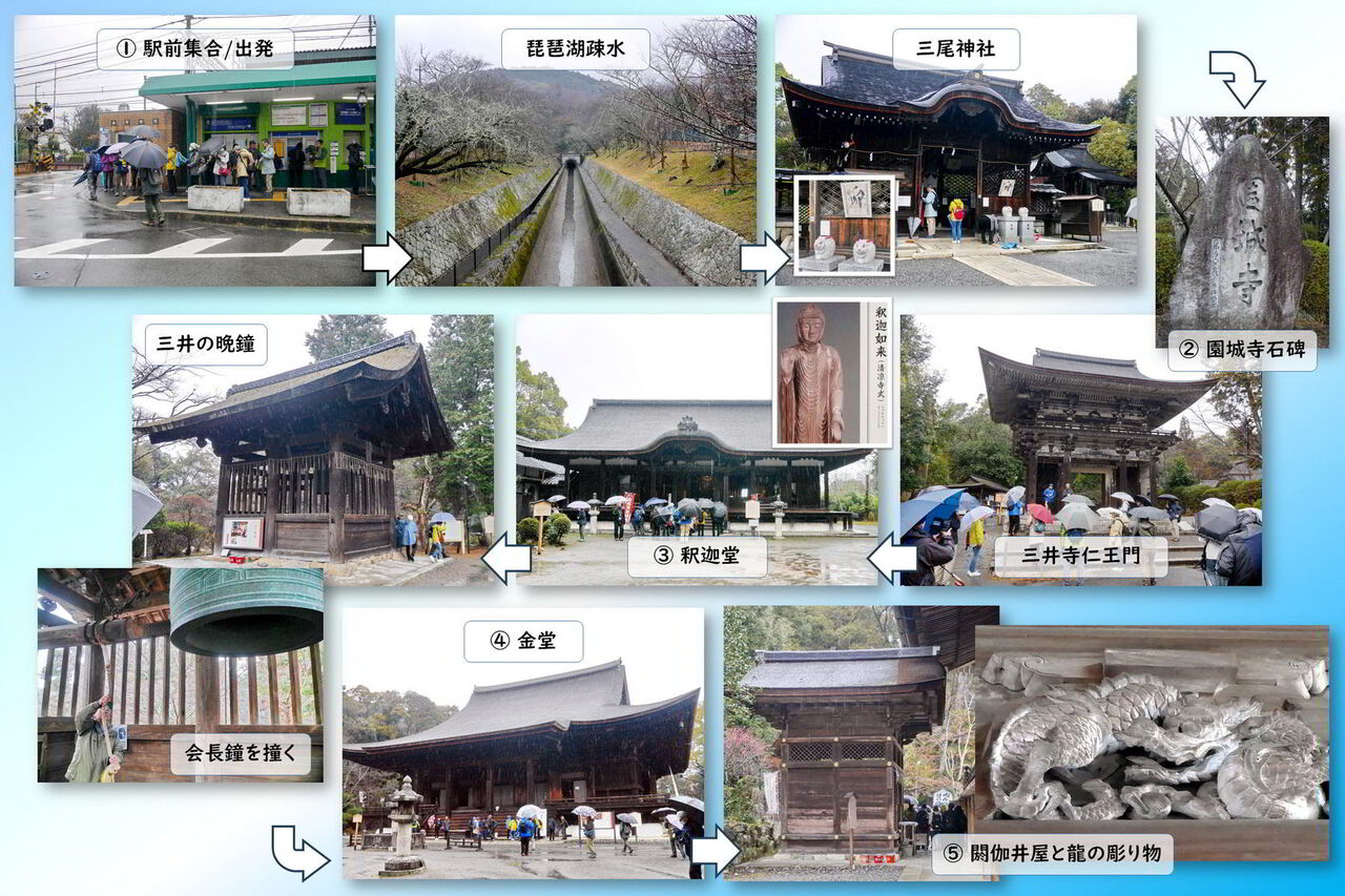 3月になっても小寒いうえ、前日に続く雨の日の例会でした。京阪石坂線の三井寺駅集合で、参加者が少ないのではないかと思っていたら、三井寺仁王門では合計27名でほぼいつもどおりの参加者となった。大津の町歩きは、前年に比叡山門前町の坂本に続いて、由緒ある歴史を学べた名寺院めぐりであった。後半の大津市歴史博物館では、三井寺でみた資料も展示されており興味深かった。三井寺のボランテイアガイドの方が、寒い雨の中だったがじつに丁寧な説明だった。