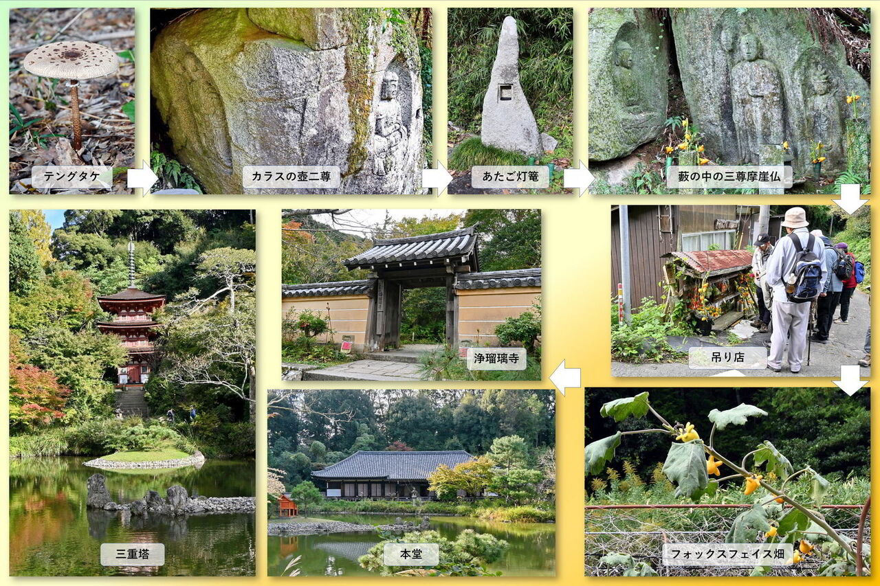 午後1時、この頃から陽射しも出て暖かくなってきて、本番の石仏巡りですが、人数が多く、人ひとりが通れる山の中の踏分け道は通らず、舗装された車道を歩いてミロクの辻を目指しました。途中、クコのピンクの花と赤い実などを観察しながら20分を歩きました。ここで岩に彫られた弥勒仏線彫摩崖仏、続いて代表的な「わらい仏」「ねむり仏」を訪ね、途中、立派なテングタケに歓声をあげながら「カラスの壺二尊」、「あたご灯篭」を経て「藪の中三尊摩崖仏」に至りました。岩船寺に次いで、ここでも、当尾名物の「吊り店」があって、実が黄色いキツネの頭のようなフォックスフェィスが人気商品でした。お値段は5年前と変わらず100円で、浄瑠璃寺に向かう道からは畑に栽培されているフォックスフェィスも見えました。