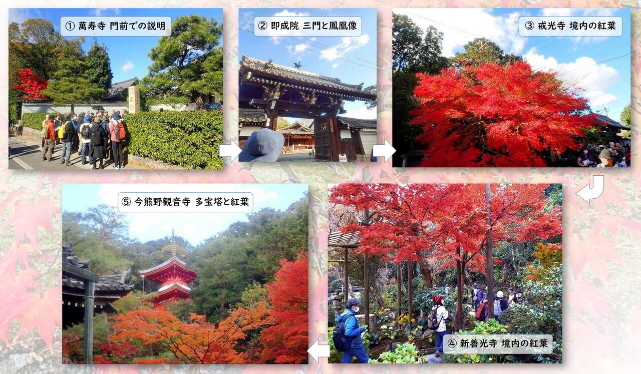 京阪東福寺駅前に会員44名と一般参加3名の計47名が10時に集合しました。駅改札口前は観光客で混雑していたので、萬寿寺の門前まで移動して、担当幹事の赤對さんのあいさつでスタートしました。案内役は松浦さんで、事前に説明資料をいただいています。天候は晴れ一時雨の予報でしたが、今は晴れています。タイトルにある「錦秋」は、木々が紅葉して、錦の織物のように美しい秋の意味です。「そうだ京都行こう」の紅葉情報では泉涌寺、東福寺は「見頃」とのこと。実際はどうでしようか。なお、「洛南」は京都市の南部をさす通称ですが今回はその一番北のエリアを巡ります。