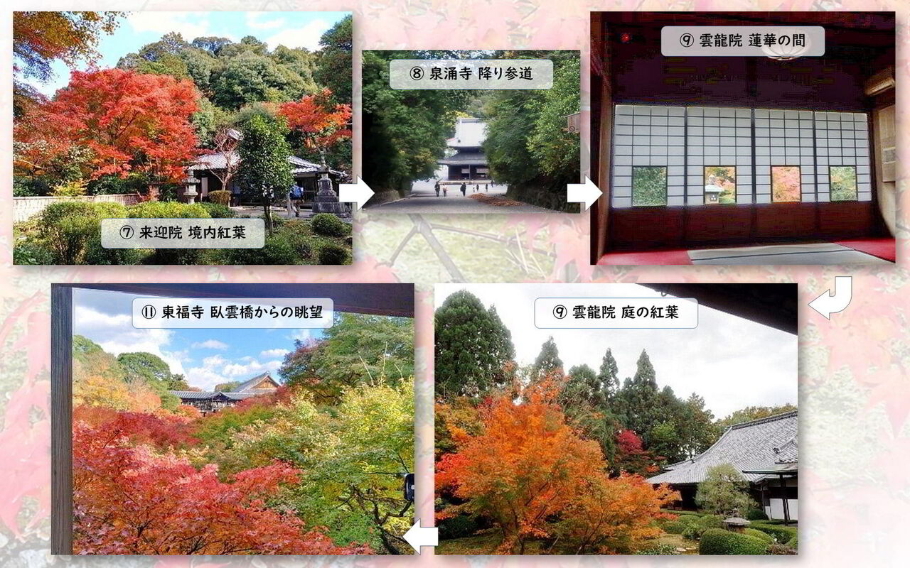 ⑨ 雲龍院 泉涌寺別院。拝観料400円を支払って入りました。入口でいただくリーフレットと『雲龍院の「へぇ~」のポイント』に沿って順路を回りました。各ポイントでも案内が工夫されていて、興味深く楽しむことができました。蓮華の間にある障子の四角いガラスから、椿、灯篭、楓、松の4枚の違った景色を眺める事ができるのが有名ですが、他にも見どころが多いお寺です。私の一番のお気に入りは、「走り大黒天」です。左足を一歩前にだしているのは福をすぐに運ぼうとする様子を表しているそうです。境内をゆっくり鑑賞したあと、門を出て裏道を下ります。
