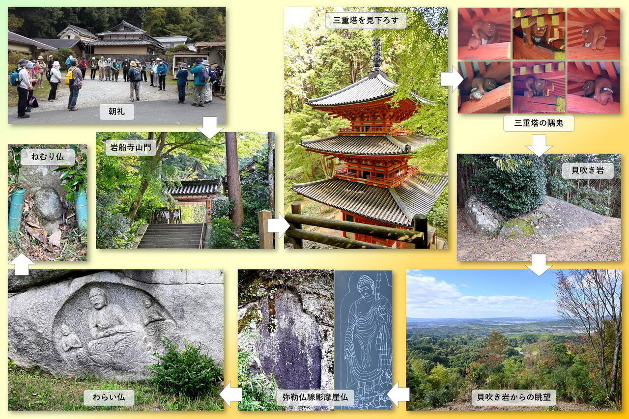 9:44発の小型の木津市のコミュニティバスの後ろに「増便」された、我々の臨時の大型バスが続いて出発です。これは最大30名が定員のコミュニティバスの増発を、市に掛け合ってくださった澤田さんの労のおかげです。バスはくねくねの山道を、約20分をかけて「花の寺」としても著名な、創建729年の岩船寺に到着です。