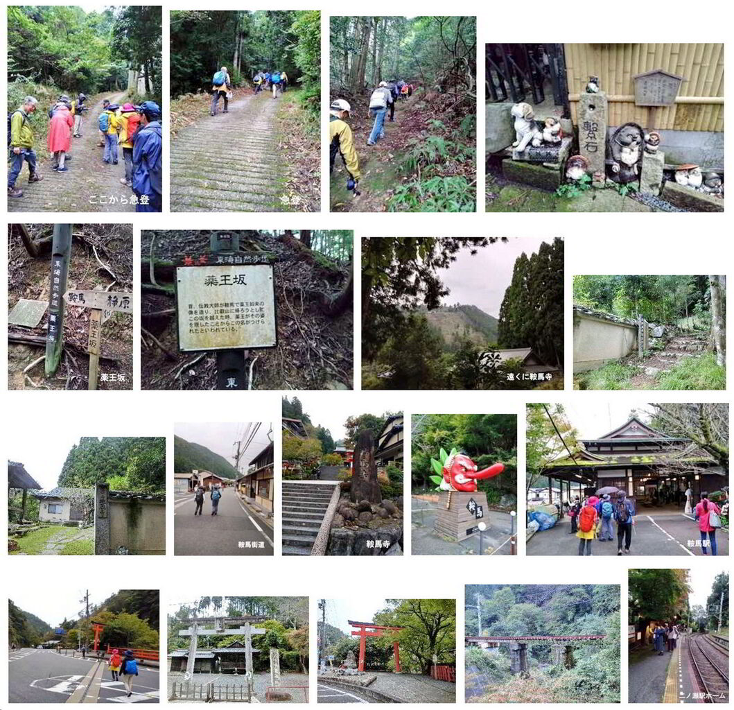 薬王坂へは急な坂の為、休憩や給水を行い登った。薬王坂の峠には12:48に到着した。その後下り坂で地蔵寺を13:09に通過して鞍馬寺の入口13:16経て叡電鞍馬駅13:20で写真撮影を行う。叡電鞍馬駅で帰られる方もいましたが、二ノ瀬まで鞍馬街道を歩いた。電車、線路も情緒があり、何よりも雨が殆ど降らずに、二ノ瀬駅13:59に着いて解散となった。